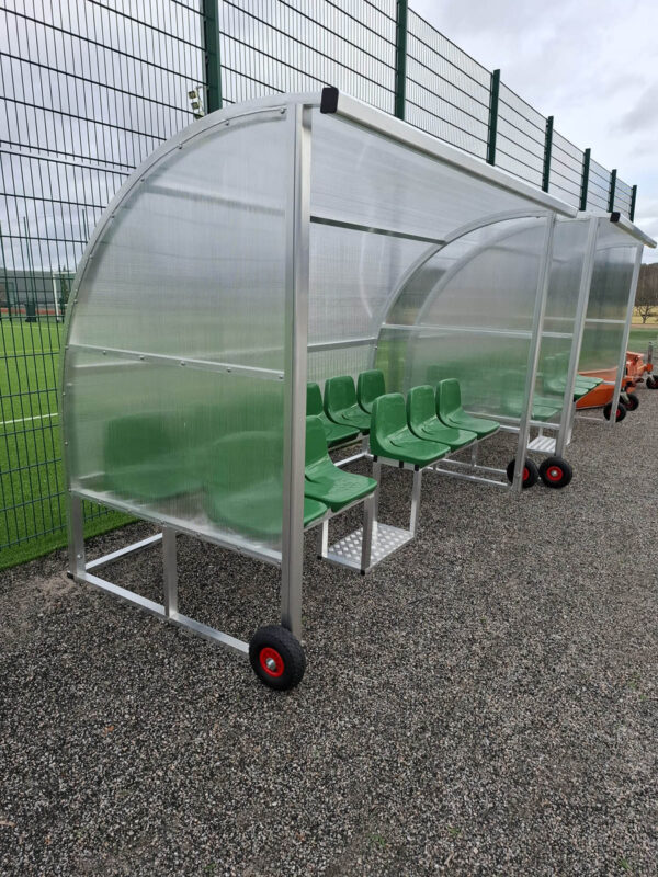 Laadukas kuppi-istuimilla varustettu 11-paikkainen alumiininen pelaaja-aitio siirtorenkailla antaa pelaajille ja valmennukselle hyvän suojan tuulelta ja sateelta.